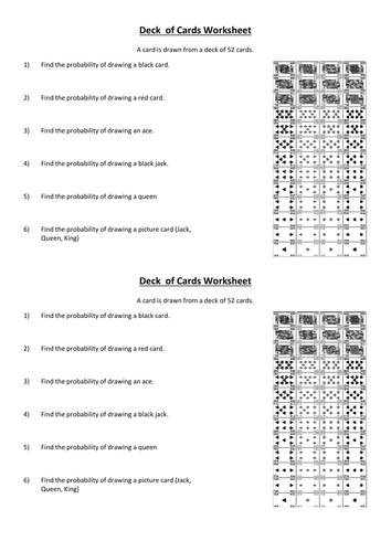 Deck of Cards Worksheet. For Students 5th - 7th. For this probability worksheet, students solve 5 problems that require them to calculate the probability of drawing the listed cards from a deck of 52. Get Free Access See Review. Lesson Planet.