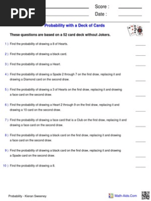 Probability With a Deck of Cards Worksheet These Probability Worksheets will produce problems about a standard 52 card deck without the Jokers. Children do the math and answer the questions in this deck of cards probability worksheet. 4 Rolling an 2 on a die. To downloadprint click on pop-out icon or print icon to worksheet.