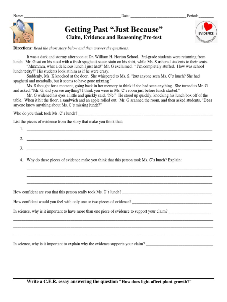 Claim, Evidence and Reasoning Practice Worksheet. Directions: Read the short story below and then answer the questions. It was a dark and stormy afternoon at Adams Middle School. Seventh-grade students were returning from lunch. Mr. G sat on his stool with a fresh spaghetti-sauce stain on his shirt, while Ms. S ushered students to their seats.