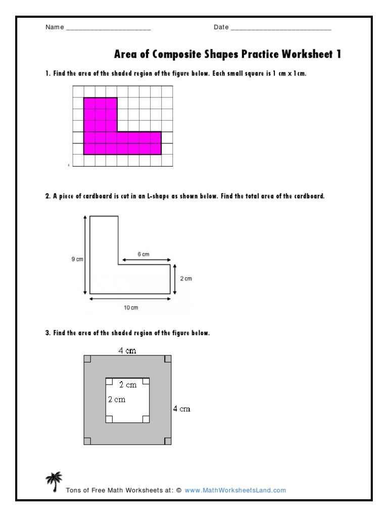 Worksheet 69 Area of composite shapes To find areas of composite shapes with straight edges: split the shape into rectangles and triangles; find the areas of the individual bits; add or deduct the areas to get the total area. We use formulae to calculate area. If a rectangle measures 5m by 3m, its area is 5 x 3 = 15 m2 (square metres). If a square is 12 mm along each side, its area is 12 x 12 ...