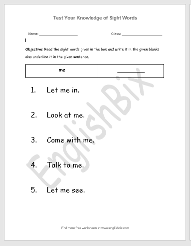 Sight Word: me. Worksheet 1: Me. On this worksheet, students will color the word, color the letters in the word, trace the word, and write the word in a sentence. View PDF. Worksheet 2: Me. Students will trace and circle the word Me. Then they'll cut out the letters and glue them on the paper to make the word.