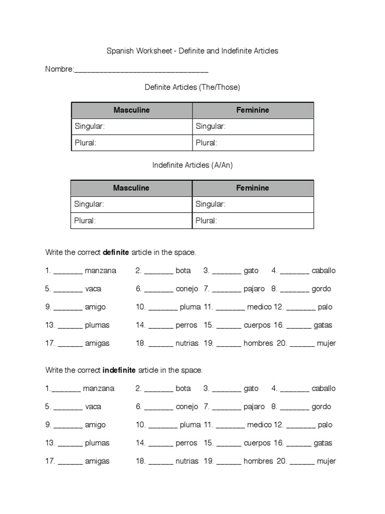 Spanish Worksheet - Definite and Indefinite Articles Nombre:_____ Definite Articles (The/Those) Masculine Feminine Singular: Singular: Plural: Plural: Indefinite Articles (A/An) Masculine Feminine Singular: Singular: Plural: Plural: Write the correct definite article in the space.