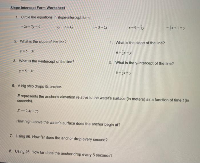 Sep 10, 2021 · Slope Intercept Form Worksheet. Practice graphing curve in slope-intercept anatomy with this eighth-grade algebra worksheet! This accessible worksheet starts with an addition that walks acceptance through how to blueprint an blueprint accustomed in slope-intercept form. Acceptance are again asked to analyze the abruptness and y-intercept of equations accustomed in slope-intercept anatomy and ...
