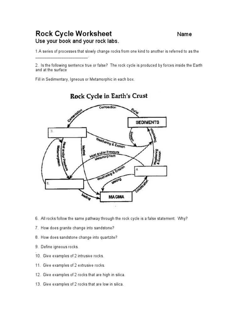 Rock Cycle Worksheet Name. Use your book and your rock labs. 1.A series of processes that slowly change rocks from one kind to another is referred to as the _____. 2. Is the following sentence true or false? The rock cycle is produced by forces inside the Earth and at the surface. Fill in Sedimentary, Igneous or Metamorphic in each box. 6.