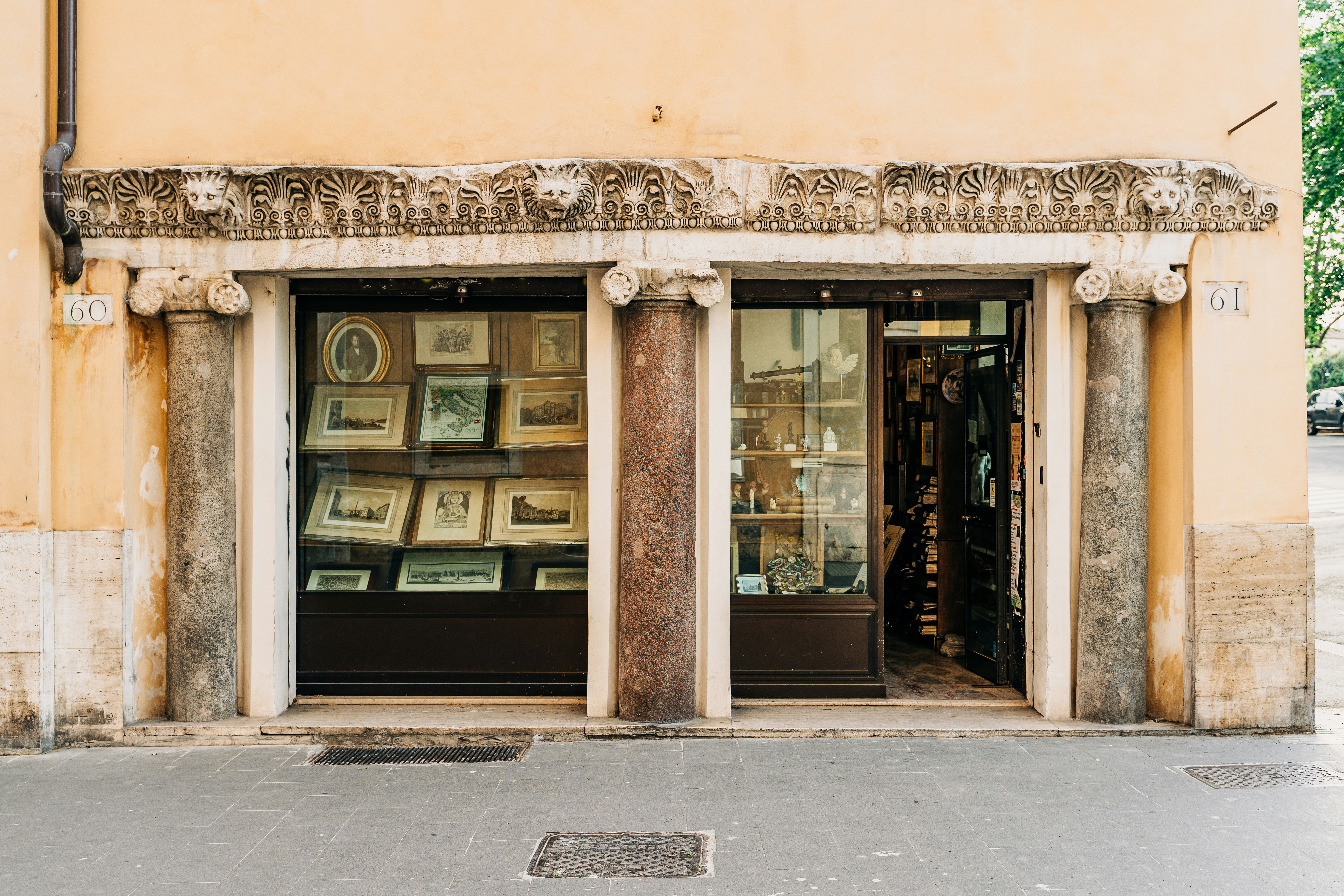 A unique collector's store selling engravings and antique art in the city of Rome, Italy. The frieze and columns around the entrance and shop window date from Ancient Rome.
