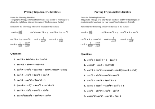 Dec 15, 2021 · Mcr3u trigonometric identities worksheet prove the following trigonometric identities by showing that the left side is equal to the right side. It is better to start with simplifying the more complicated side so that. Sinx sinxcos2 x sin3 x 4. Tan2 x sin x tan2 x sin2 x trig identities worksheet 3 4. 6 trigonometric identities worksheet author. Download Free Trig Identities Worksheet With Answers Wiskunde Vir Almal Precalculus is adaptable and designed to fit the needs of a variety of precalculus courses. It is a comprehensive text that covers more ground than a typical one- or two-semester college-level precalculus course. The content is organized by clearly-defined learning Trig Prove each identity; 1 . 1 . secx - tanx SInX - - secx 3. sec8sin8 tan8+ cot8 sin' 8 5 .cos ' Y -sin ., y = 12" - Sin Y 7. sec2 e sec2 e-1 csc2 e Identities worksheet 3.4 name: 2. 1 + cos x = esc x + cot x sinx