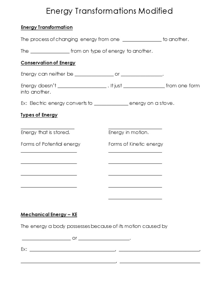 Download Grade 5 free worksheets on Energy Transformations. ... Energy transformation on the other hand, ... energy. Whether it is transferred or transformed, the total amount of energy doesn't change. This is known as law of conservation of energy. Download Worksheet - Energy Transformations. Energy transformation worksheet with answers. This worksheet will challenge and improve students understanding of transformation and conservation of energy. Some of the worksheets below are energy transformations worksheets. In every energy transformation some thermal is released. However scribd is not free.