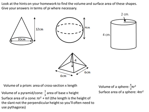 (diagonal of box, surface area and volume), prisms (volume), pyramids (volume), cone (slant height, lateral surface area, total surface area, volume), cylinder... Fill in and check answers.for rectangular prisms, cylinders, square based pyramids, cones, spheres. Note to Ohio learners: for spheres and cones, only find volume....
