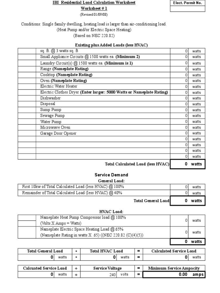 The worksheet helps to provide an accurate, consistent, and simplified method of determining the minimum size electrical service for a new or existing dwelling looking to add additional electrical load. Download the Worksheet The Residential Load Calculation Worksheet is a Microsoft Excel (.xls) file.