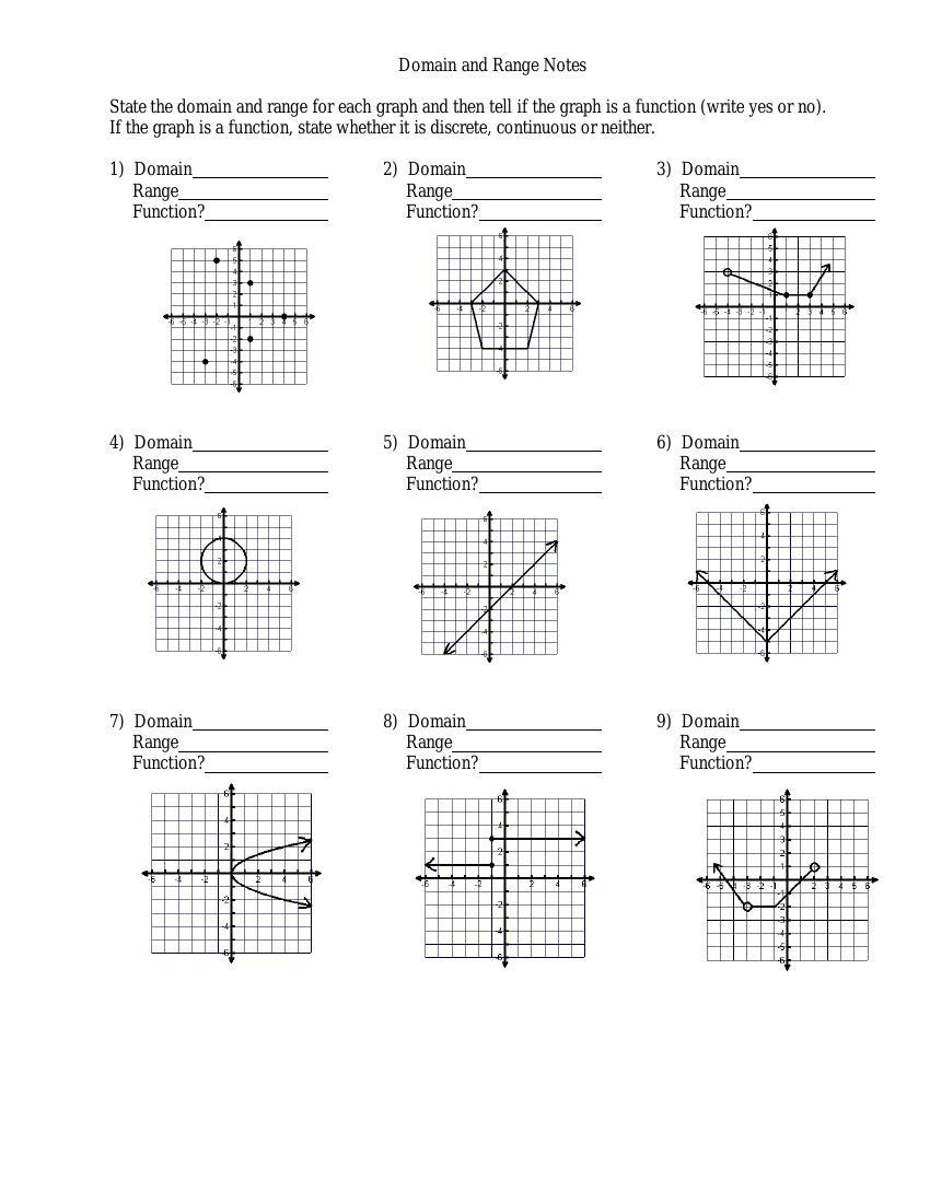 Domain and range are necessary to understand when studying mathematical functions at an advanced level, and this quiz/worksheet will help you test your knowledge of their definitions and ... Domain and Range Worksheet #1 Name: _____ State the domain and range for each graph and then tell if the graph is a function (write yes or no). If the graph is a function, state whether it is discrete, continuous or neither. 1) Domain 2) Domain 3) Domain Range Range Range Extended Algebra 1. Name: Functions Worksheet 1. For exercises 1-6. decide whether each graph is the graph of a function. Then determine domain and range.4 pages