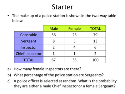 Create a two-way relative frequency table for these data. 2) The table shows the grade levels and primary home languages for all the students at Martin Middle School. th6 Grade 7th Grade 8th Grade Total English 104 99 116 319 Other 56 81 84 221 Total 160 180 200 540 Use the grid below to create a two-way relative frequency table. th6 Grade 7th ... Videos, examples, solutions, and lessons to help Grade 8 students understand that patterns of association can also be seen in bivariate categorical data by displaying frequencies and relative frequencies in a two-way table. Construct and interpret a two-way table summarizing data on two categorical variables collected from the same subjects. 10 minutes. As students enter I hand each an Entrance Slip to begin Part 2 of our lesson on Two-way Tables. Completing this table helps students to recall yesterday's lesson and helps us to begin moving into new content. After students complete the questions below the chart, I will call on volunteers to share their responses. (a) Complete the two-way table. (2) (b) Write down the probability that a student chosen at random had joined a society. 4 The table shows the number of students in Grade 8 and 9 who had a mobile phone. Has a mobile phone No mobile phone Total Grade 8 51 100 Grade 9 62 120 Total (a) Complete the two-way table. (2) (b) Write down the probability ...