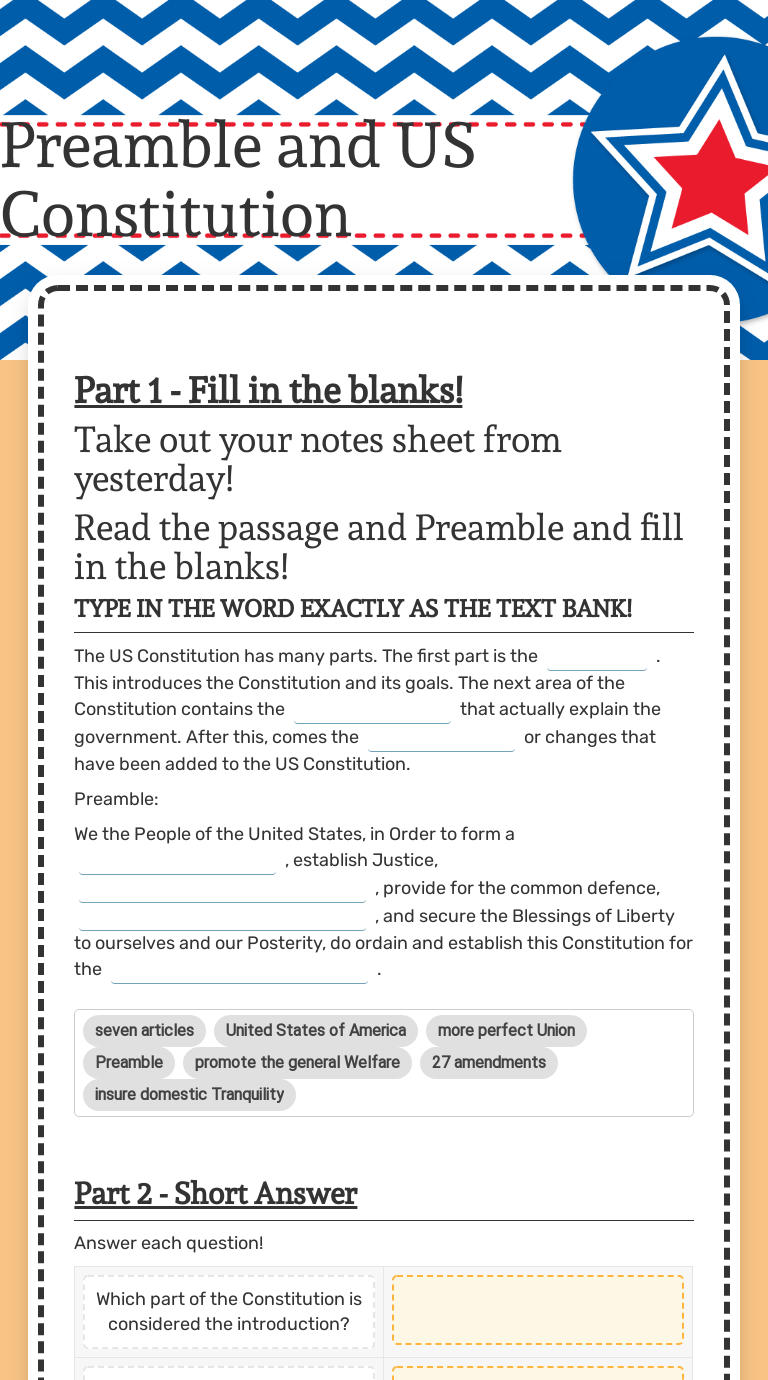The following collection of worksheets examines the role of the Constitution in shaping the United States government. Your students will learn about the separation of powers, the three branches of government and how they function as checks and balances, the founding fathers, and more. Each reading passage is accompanied by questionnaires. Teacher-approved stories, resources, and worksheets for teaching about the United States Constitution in your classroom, courtesy of Junior Scholastic, ... EspaƱol by Sol Bloom Q. How were deputies to the Constitutional Convention chosen? A. They were appointed by the legislatures of the different States. this compilation of printable worksheets on u.s. constitution helps children of grade 3 through grade 8 in learning the frequently used terms with the constitutional vocabulary, comprehend the seven basic principles, preamble, bill of rights, amendments 11 through 27, figure out the functions of three branches of the government, understand the …