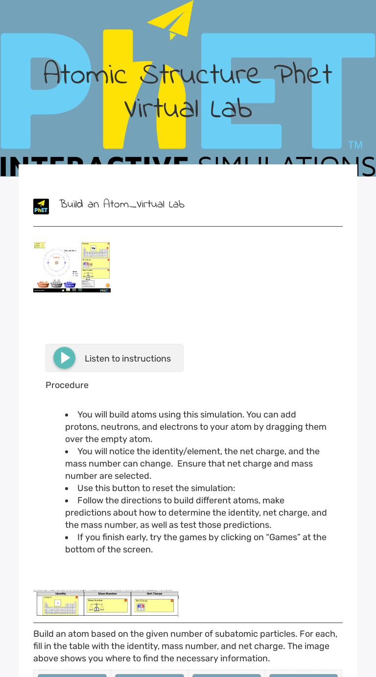 Building an atom worksheet answers. PDF Microsoft Word - Phet Building an Atom worksheet.docx Building An Atom. Part I: atom screen. 1. Go to the website: phet.colorado.edu. 2. Explore the Build an Atom simulation. Click on the + sign for each of the boxes (element name, net charge and mass number) to view changes as you change the number of particles in the atom. Atomic Structure Worksheets An awesome collection of free atomic structure worksheets for teachers. An atom is the smallest constituent unit of ordinary matter. These worksheets have students explore the nature of atoms and their structure. We look at the function of each of the subatomic particles and how they interact... Build An Atom Worksheet-Answers | PDF | Atoms | Proton Build an Atom Worksheet-Answers - Free download as Word Doc (.doc / .docx), PDF File (.pdf), Text File (.txt) or view presentation slides online. html Answers Instructions: After completing each Name of element Symbol Stable? Charge Mass Atomic Number of Number of Number of of the following... Building An Atom Worksheet Answers - Promotiontablecovers Atoms Worksheet Elements And Atoms Worksheet The Best Worksheets. Phet Build An Atom Activity Guide By James Gonyo Tpt. Bohr Model Worksheet Answers Tecnologialinstante Worksheets. Isotopes Ions And Atoms Worksheet 1 Answer Key Briefencounters.