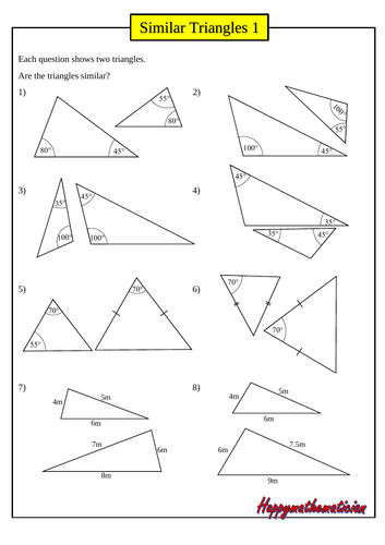 Similar Triangles Worksheets - Math Worksheets 4 Kids Explore this multitude of printable similar triangles worksheets for grade 8 and high school students; featuring exercises on identifying similar triangles, determining the scale factors of similar triangles, calculating side lengths of triangles, writing the similarity statements; finding similarity based on SSS, SAS and AA theorems, solving algebraic expressions to find the side length and ...