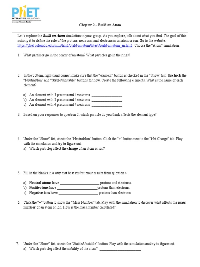 Build an Atom Student Worksheet - PhET Contribution Jun 15, 2015 — CP 17 Lab 2 Build an Atom PhET Simulation.docx - 185 kB; Build an Atom PhET Simulation Answer Key.pdf - 1527 kB.Simulation(s): Build an Atom (HTML5)Type: Guided ActivityLevel: High School, Middle School