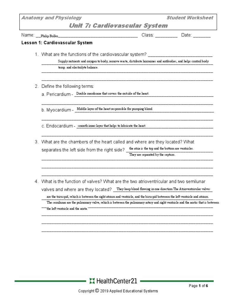 The Circulatory System Worksheets - DSoftSchools Some of the worksheets below are The Circulatory System Worksheets, Structure of the Heart, Heart Valves, Quizzes, Circulatory System Anatomy and Basic Functions, Types of Blood Vessels worksheet, Circulatory System Vocabulary, Activities, The Circulatory System - Definitions, Multiple choices questions, … Once you find your worksheet(s), you can either click on the pop-out icon or ... PDF Worksheet - Cardiovascular System Worksheet - Cardiovascular System 1. BE SURE TO KNOW THE CARDIAC ANATOMY FROM YOUR LAB EXERCISE. 2. Blood pH must be maintained in a range from a low of _____ to a high of _____. The Circulatory System Worksheets Part B - DSoftSchools The Circulatory System Worksheets Part B. admin February 5, 2019. Some of the worksheets below are Introduction to the Circulatory System : The Heart, The Blood Vessels, Circulatory System Functions, Healthy Circulatory and Respiratory Systems - Teacher's Guide Middle School , The Cardiovascular System: The Heart - Definitions with ... 40 human circulatory system worksheet answers - Worksheet ... Human Circulatory System Worksheet Answer Key Jan 30, 2022 · Human Circulatory System Worksheet Answer Key. Worksheets and also even more cover a wide variety of topics, consisting of mathematics, science and also principles. on our internet site on a daily basis Have a look at our web site in addition to lookup for the details you are looking for!