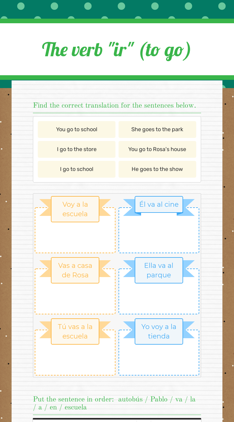 Practice with the verb ir worksheet Live worksheets > Spanish. Practice with the verb ir. What is the correct form of ir for each sentence? ID: 138187. Language: Spanish. School subject: Español como Lengua Extranjera (ELE) Grade/level: 2nd and up. Age: 8+. Main content: Practice the verb ir.