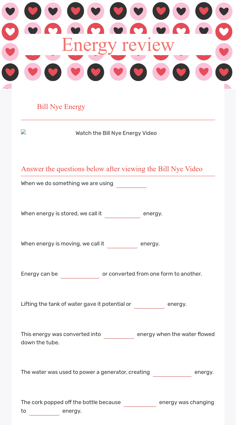 Bill Nye Energy Worksheet.docx - Course Hero View Bill Nye Energy Worksheet.docx from ENGLISH 1 IDK at Winderemere High School. Name _ Period _ Please type your answers in the space of the blank in a COLOR. Bill Nye, the Science Guy! ENERGY 1. Bill Nye Energy Video Worksheet Answers - Worksheet Answer Key Bill Nye Energy Video Worksheet Answers - Every parent wishes for his or her youngster to be able to connect properly in English. To do this, you must have excellent command of the language's grammar. Having to discover the 8 words and also expressions is the primary step in a child's trip toward understanding grammar.