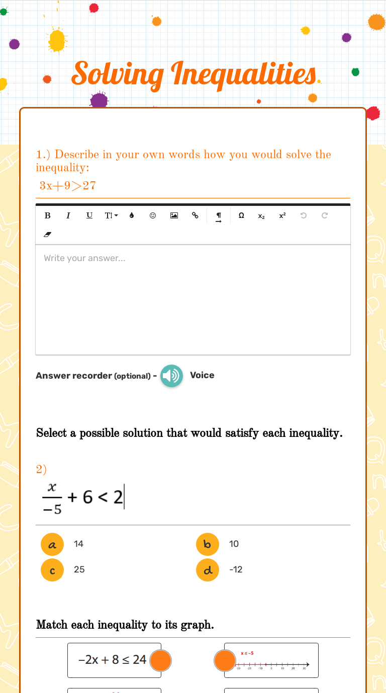 Solving Equations & Inequalities Practice | Interactive Worksheet by... Solving Equations & Inequalities Practice Worksheet. April 29, 2021. Click here to review how to solve and graph inequalities. Add some description here to focus your students on what's important in this link.
