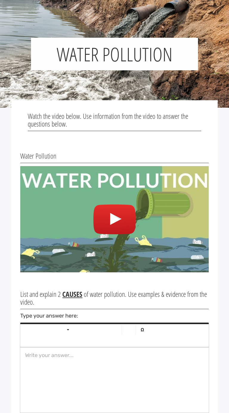 PDF Pollution - Worksheet 2a • Ask pupils 'What is water pollution?' and 'How is water polluted?' and ask for examples of when/where they have seen polluted water. • Note their answers on a central board or large sheet of paper • Hand out Worksheet 1 and read through with the class discussing key.