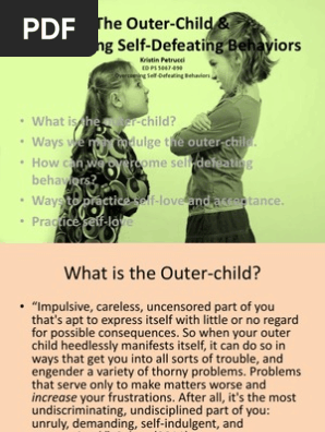 Self-Defeating Behaviors by Marla Scott Let's Take an INVENTORY! Add your numbers to get your total score Self-Defeating Behaviors Let's Discuss What behavior problems do you have that can hurt your academic performance? What would you suggest to a friend that seems to be unable to change a negative pattern of. Five Self-Defeating Behaviors that Ruin Companies and Careers Self-defeating behaviors can make any situation worse. Put these five on the what-not-to-do list. Humility prevents self-defeat. A desire to serve others, an emphasis on values and purpose, a sense of responsibility for long-term consequences, and knowledge of both strengths and limitations can make... Self Sabotage How To Banish Self Destructive Behaviors Worksheet Self-sabotage: how to banish self-destructive behaviors worksheet. When you engage in self-sabotage, you prevent yourself from living a Complete this worksheet to gain a better understanding of how you engage in self-defeating behaviors and discover methods to banish your... How to Change Your Self-Defeating Beliefs Self-defeating beliefs are categorized as either being negative views you have about yourself or the beliefs you hold about your relationships with others. Overcoming Self-Defeating Beliefs. Our belief system is always with us, shaping our opinions and attitudes about our selves and the world around us.