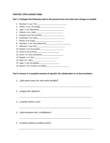 Stem change verbs practice worksheet | Teaching Resources A practice worksheet / quiz on stem change verbs in the present tense. Verbs included: devolver, volver, jugar, preferir, empezar, comenzar, pensar, entender, almorzar, preferir, tener, servir, repetir, pedir, jugar, querer. Part 1: Conjugate the 16 verbs making stem changes as needed. (Stem changes are listed next to each infinitive) Ex ...