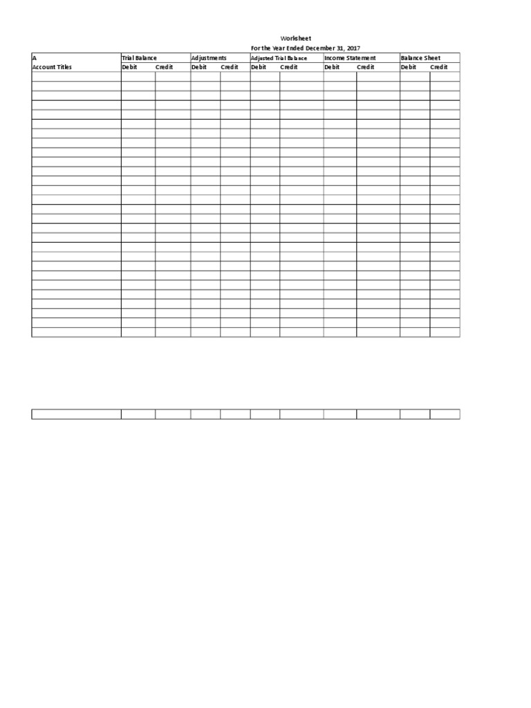 Free Trial Balance Template (Excel, Word, PDF) - Excel TMP Unadjusted trial balance is the initial and foremost document to be made for final accounts. It must be prepared before passing any adjustable entries. Adjustable trial balance Adjustable trial balance is prepared to know about the adjustment entries passed are correct or not after making all the adjustments. Post-closing trial balance Acct 201 Exam 2 Flashcards & Practice Test - Quizlet Part A: The adjusted trial balance columns of the worksheet for Sunland Company are as follows. The owner did not make any additional investments in the business in April. Prepare an income statement. (Enter negative amounts using either a negative sign preceding the number e.g. -45 or parentheses e.g. (45).) The adjusted trial balance columns of the worksheet for ... The adjusted trial balance columns of the worksheet for Albanese Company are as follows. Albanese Company Worksheet For the Month Ended April 30, 2014 Adjusted Trial Balance Income Statement Balance Sheet Account Titles Dr. Cr. Dr. Cr. Dr. Cr. Cash 7,442 Accounts Receivable 7,840 Prepaid Rent 2,280 Adjusted Trial Balance and Financial Statements.docx ... Input the Adjusted amounts in the Adjusted trial balance. Step 4: Extend the assets, liabilities, and owner's equity amounts from the adjusted trial balance columns to the Balance sheet columns . Extend the income and expense amounts to the Income statement columns.