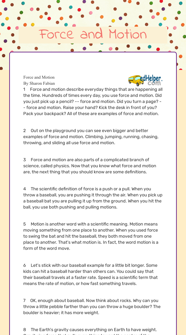 gravity worksheet, forces worksheet, motion worksheet Force And Motion. Gravity Worksheets :: Teacher Resources and Classroom Games. Teaching Ideas. Gravity Worksheets :: Teacher Resources and Classroom Games. Select from a large range of generated, static or user created worksheets.