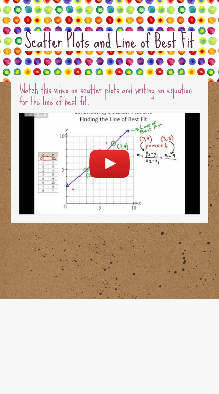 Creative Scatter Plot Line Of Best Fit Worksheet - The ... The scatter plots and lines of best fit worksheet can be used to help those who have questions about scatter plots and lines of best fit. Intermediate lesson this lesson focuses on calculating slope and applying the line of best fit. This equation can help us predict future values. These worksheets explain how to read and interpret scatter plots.