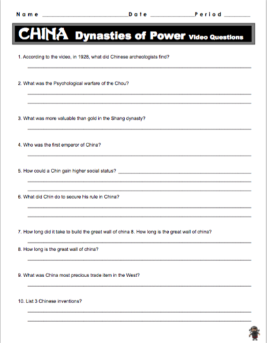 Video Worksheet 5.1_China-Dynasty of Power.docx - HIST ... View Homework Help - Video Worksheet 5.1_China-Dynasty of Power.docx from HIST 1110 at University of Memphis. HIST 1110 Section _ China ~ Dynasties of Power _Amelia