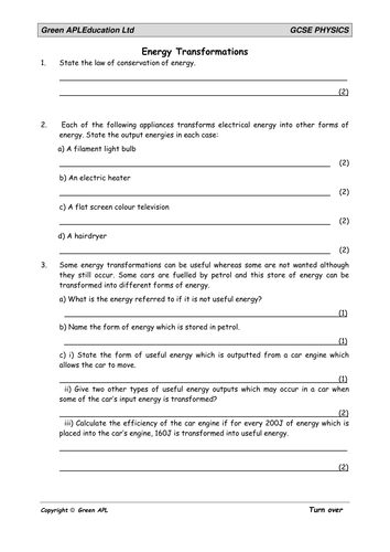 Energy transformations worksheet with answers