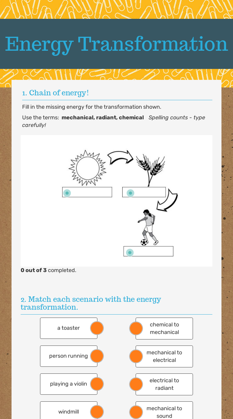 Energy Transformation Worksheet - Studying Worksheets Energy Transformation Worksheet With Answers. Heat light sound electrical kinetic motion potential energy of. Energy Transformation Worksheet Identify the different types of energy transformation in each of the pictures Record the answer to each question 10 points each in your science notebook on page 12a or right after your energy foldable notes.