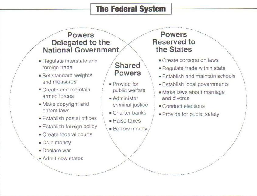 PDF Chapter 4: Federalism Section 1 - Central Lyon • Federalism also lets the nation respond in a united ... ruled that when federal and State laws conflict, the federal law wins if it is constitutional. • How does the disastrous result ... answer the Chapter Essential Question. -Is the federal system the best way to govern PDF Teacher's Guide The "Federal" in Federalism Learning Objectives Students will be able to: Define federalism Explain that government power in the U.S. is shared between state governments and a central government Identify federal, reserved, and concurrent powers paper to the board Define expressed and implied powers Explain the significance of the Supremacy Clause and the