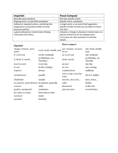 Passé Composé Vs Imparfait Worksheets & Teaching Resources ... Passé Composé vs Imparfait French Worksheet 2 by jer520 LLC 29 $1.00 $0.80 Word Document File Worksheet has 18 fill in the blank sentences, choosing between Passé Composé and imparfait. Students are also to underline any key words (lundi / le lundi) and give the reason for choice of tense. Good also as a quiz. Subjects: Foreign Language, French
