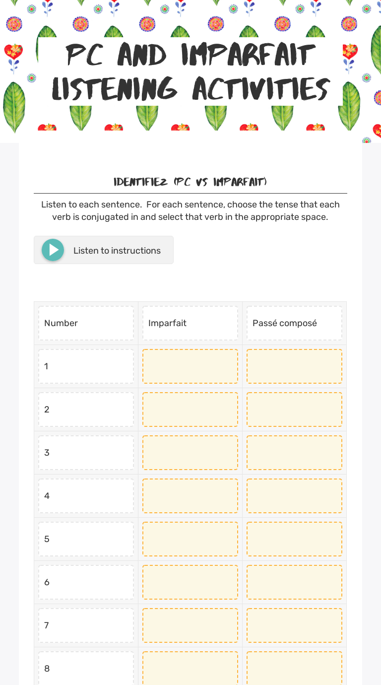 PDF Passe Compose Passages 000 worksheets page 1' 'passe compose worksheets teacher worksheets may 12th, 2018 - displaying 8 worksheets for passe compose worksheets are pass compos work pass compos with avoir regular verbs pass compos with avoir irregular past participles' 'French Imparfait vs Passé Composé Make 4 / 7 Passé composé vs L'Imparfait #3 || Conjuguemos Worksheet & Printables . Fill-the-blank Worksheet . Log in Sign up. Guest. Log in Sign up. Home. Passé Composé Vs L'imparfait #3 . Study You're logged in as a Guest. Log in to save your progress. Graded Practice . Lots of ways to interact with the activity. Click here for a short tutorial on each mode. X Video Tutorial ...
