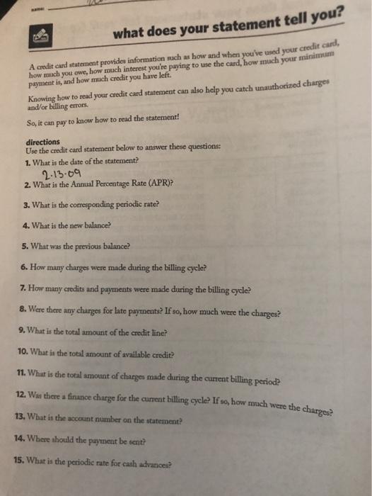 PDF Understanding a Credit Card Statement Understanding a Credit Card Statement Name_____ Date_____ Class_____ Directions: Refer to the provided credit card statement to answer the following questions. 1. What is the current APR for purchases, balance transfers, and cash advances? (3 points) 2. PDF Full Year Course: Answer Key Document 3.2 Intro to Credit Cards - Sample Completed Student Activity Packet 9 CALCULATE: Shopping with Interest 13 RESEARCH: Credit Card Laws WebQuest Do More PROJECT: Budgeting for Your Credit Card Payments CQs Intro to Credit Cards Comprehension Questions *No Answer Key available - assignment is open-ended. B ack to Top Last updated: 4 ...