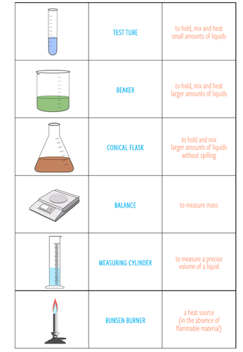 Lab Introduction - Identify Equipment and Uses Plus, you can just pull items from your lab cabinets, choosing things appropriate for the grade level. Here's a list of things you might display: Pipet (micropipette) Inoculating Loop Petri dish Graduated cylinder Beaker Test tube Test tube clamp Bunsen burner Thermometer Forceps Syringe Microscope slide Safety goggles Well plate