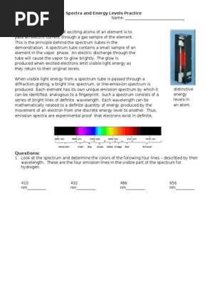 filmreview.us Relative atomic mass of Q _____ Element Q _____ (3) In the space provided, write the letter of the term or phrase that best completes each statement or best answers each question. emission spectra and energy levels worksheet answers16 Best Images of Atomic Spectra Worksheet - Electromagnetic Spectrum Worksheet Answers, Atomic from www. EmissionSpectraEnergyLevelsPractice.pdf - Name Date Pd ... movement of an electron from one discrete energy level to another. Thus, emission spectra are experimental proof that electrons exist in definite, distinctive energy levels in an atom. Questions: 1. How can the difference in the brightness of spectral lines be explained? The thickness (brightness) depends on the number of photons.