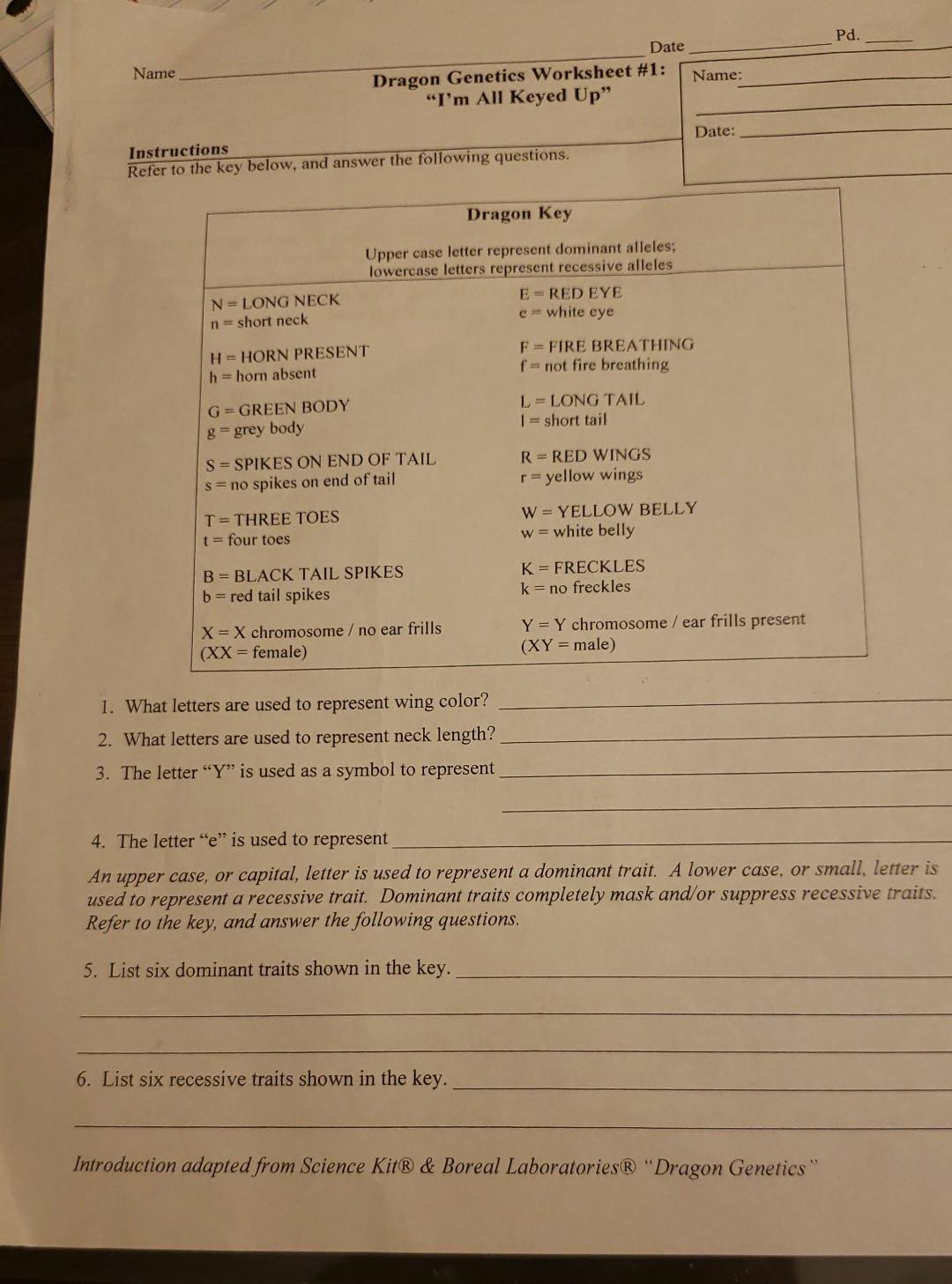 Solved Pd. Name Date Dragon Genetics Worksheet #1: Name ... Biology questions and answers. Pd. Name Date Dragon Genetics Worksheet #1: Name: "I'm All Keyed Up" Date: Instructions Refer to the key below, and answer the following questions. Dragon Key Upper case letter represent dominant alleles; lowercase letters represent recessive alleles E = RED EYE e white eye N=LONG NECK n = short neck H = HORN ...