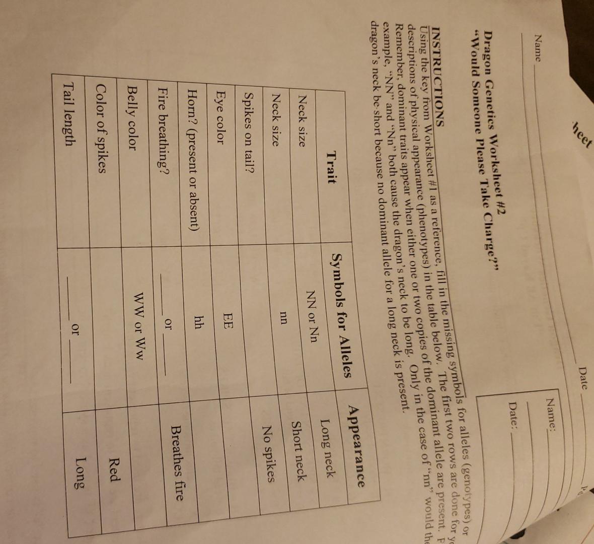 stuffi-design.de › readworks-spring-poetry-answer-keystuffi-design.de Open Menu Close Menu. Readworks spring poetry answer key Dragon Genetics Worksheet Answer Key - Worksheet Answer Key Dragon Genetics Worksheet Answer Key The division process is straightforward. Incorporating and divising numbers to develop a new number is an arithmetic procedure. Reward describes the resulting number after it has actually been separated. The divisor is the number whereby we split our numbers. Worksheet Answer Key - Page 66 of 108 - Free Printable ... Dragon Genetics Worksheet Answer Key - Your child is currently prepared to go on to more advanced mathematics ideas, such as reproduction as well as department. A fun-themed department worksheet for your kids is what we have for you this week. It's stemmed from the… DOC Dragon Genetics Worksheet #1: Dragon Genetics Worksheet #1: "I'm All Keyed Up" Instructions. Refer to the key below, and answer the following questions. Dragon Key. Upper case letter represent dominant alleles; lowercase letters represent recessive alleles N = LONG NECK. n = short neck E = RED EYE. e = white eye H = HORN PRESENT.