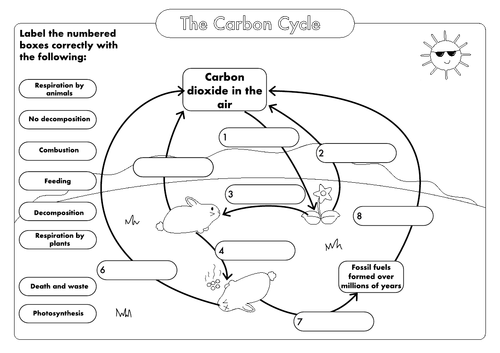 Carbon Cycle Worksheet Activity | Earth and Space Science Explore the carbon cycle with our Carbon Cycle Worksheet. Our Carbon Cycle Worksheet includes a diagram of the carbon cycle, along with five questions to test students' comprehension. The diagram of the carbon cycle provided illustrates the process that carbon goes through. This includes respiration, photosynthesis, combustion, death, fossil fuels, dissolving and evaporation. ...