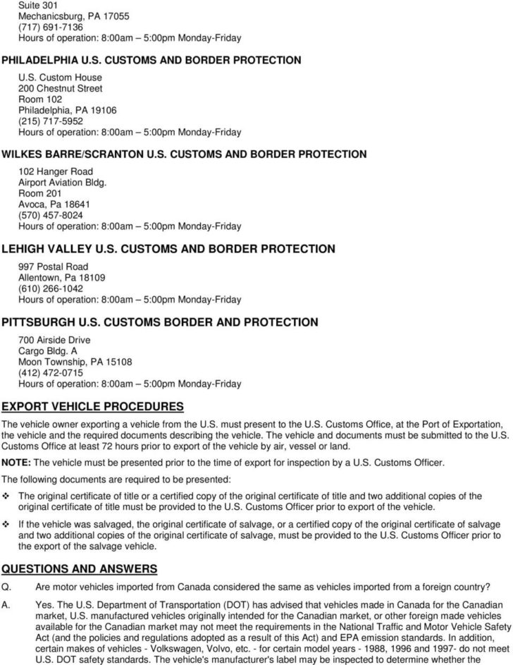 Forms | U.S. Customs and Border Protection CBP Form I-95 - CREWMAN'S LANDING PERMIT. *The OMB Date is expired, however this form is still valid for use and is under review by OMB awaiting a new expiration date. Read more. about CBP Form I-95 - CREWMAN'S LANDING PERMIT. 19 CFR § 192.2 - Requirements for exportation. | CFR | US ... (a) Basic requirements. A person attempting to export a used self-propelled vehicle shall present to Customs, at the port of exportation, both the vehicle and the required documentation describing the vehicle, which includes the Vehicle Identification Number or, if the vehicle does not have a Vehicle Identification Number, the product identification number. Moving Canada Systems Inc. (REQUIRED DOCUMENTS FOR CANADA) US Customs Service Vehicle Export Worksheet Instructions For Vehicle Export from USA ( 60 K ) Form #3299 can be viewed and printed from a workstation using the freely available Acrobat Software from Adobe Systems. REACH US AT: Toronto, Ontario Canada (office area) Phone: 519-923-6444 ...
