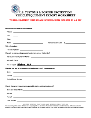 U S Customs Vehicle Export Worksheet - Fill Online ... Fill U S Customs Vehicle Export Worksheet, Edit online. Sign, fax and printable from PC, iPad, tablet or mobile with pdfFiller Instantly. Try Now!