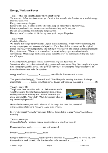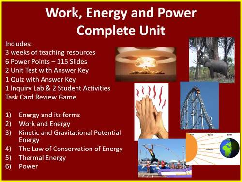 Energy Work And Power Worksheets & Teaching Resources | TpT A set of 24 Physics Task Cards for Energy, Work and Power. Problems range from basic calculations and descriptions to more challenging word problems and two-step calculations. Answer Key (included) has been triple-checked and allow for teachers to use gravity = 9.8, 9.81 or 10 m/s^2 without student Subjects: