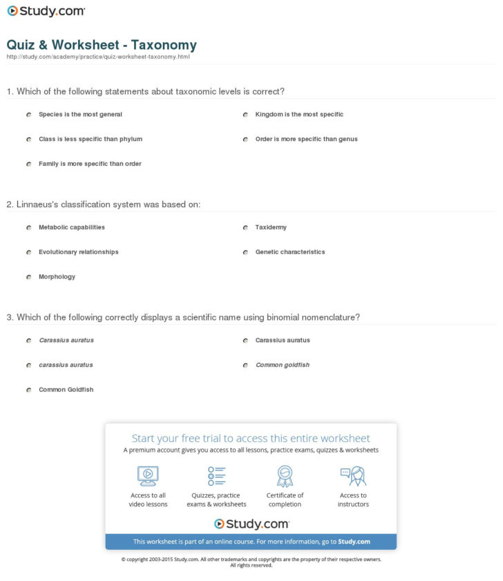 Quiz & Worksheet - Taxonomy | Study.com The following objectives will be addressed in the lesson: Distinguish various taxonomic levels. Identify binomial nomenclature in scientific names. Understand the level of organization in taxonomy ...