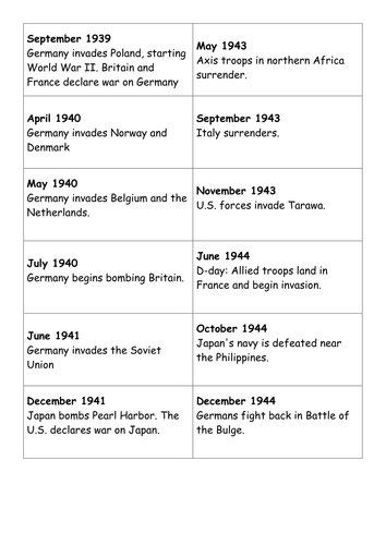 World War 1: Timeline activity | Teaching Resources docx, 262.32 KB. docx, 25.88 KB. jpg, 2.6 MB. A chronological activity for students in which they have to place a selection of significant historical events accurately on a timeline of the First World War. There is a teacher-produced model and a model produced by a student.
