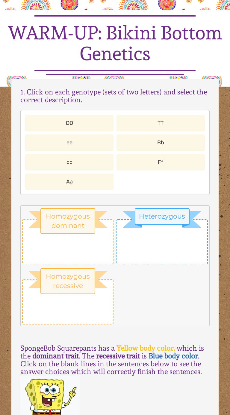 Bikini bottom genetics worksheet. PDF Spongebob Bikini Bottom Genetics Worksheet Title: Spongebob Bikini Bottom Genetics Worksheet.pdf Author: P00106250 Created Date: 5/13/2019 4:34:34 PM PDF Use your knowledge of genetics to complete this worksheet. Bikini Bottom Genetics 2 Name _____ Use your knowledge of genetics to complete this worksheet. 1. Use the information for SpongeBob's traits to write the phenotype (physical appearance) for each item. ... Use your knowledge of genetics to answer the questions below. (a) If SpongeGerdy's father is a heterozygous squarepants and her mother is a Bikini Bottom Genetics | Biology - Quizizz Bikini Bottom Genetics. a year ago by . David VanLeeuwen. 54% average accuracy. 3043 plays. 9th - 10th grade . Biology, Science. 1 Save Share Copy and Edit Edit. Super resource. With Super, get unlimited access to this resource and over 100,000 other Super resources. Thank you for being Super. Get unlimited access to this and over 100,000 Super ... Bikini Bottom Genetics student worksheet NEW.docx Download Free DOCX Bikini Bottom Genetics student worksheet NEW.docx Matthew Thomas Full PDF Package This Paper A short summary of this paper 25 Full PDFs related to this paper People also downloaded these free PDFs