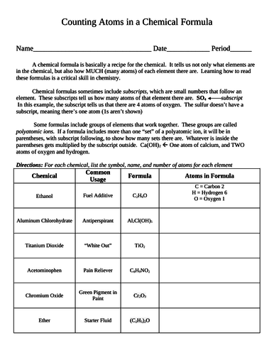 Counting Atoms Worksheet Answers Clear - Free Printable Worksheets For ... Counting Atoms Worksheet Chemical formulas consist of element symbols and numbers that indicate how many atoms of each element are present. A Li 2 SO 4 d CaClO 3 2 g MgOH 2. In CO 2 there is 1 Carbon atomwe dont write the 1 in the chemical formula and 2 Oxygen atoms.