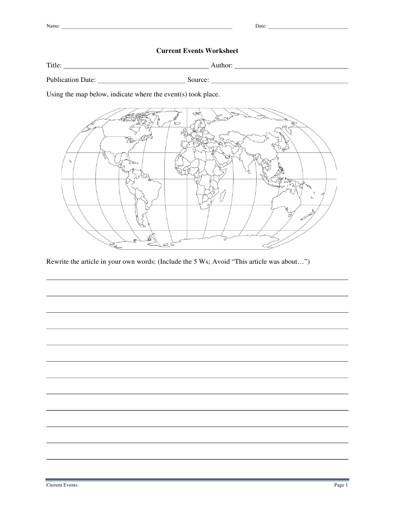 PDF CURRENT EVENTS WORKSHEET - Snoqualmie Valley School District CURRENT EVENTS WORKSHEET DATE DUE:_____ Directions: Find an article either in the newspaper or online from a credible news source (Time.com, CNN students news, USA Today, The New York Times, MSN, Google, or any other reputable national or local source). Read the article and fill out the prompts below. You may not 7 Free Current Events Websites for Students - Literacy In Focus If you don't want to recreate the wheel, you can add diversity to your current event assignments with these printable AND digital standards-aligned templates. Each current event worksheet focuses on a different reading comprehension skill including main idea & details, text connections, vocabulary in context, fact vs. opinion, and summarizing. PDF Current Event Worksheet - School Webmasters CURRENT EVENTS WORKSHEET Directions: Find an article either in the newspaper or online from a newspaper source, Time.com, USA Today, The New York Times, etc., or any other reputable national or local source. Read the article and fill out the statements or answer the questions below. You may not use articles on Entertainment/Gossip or Sports.