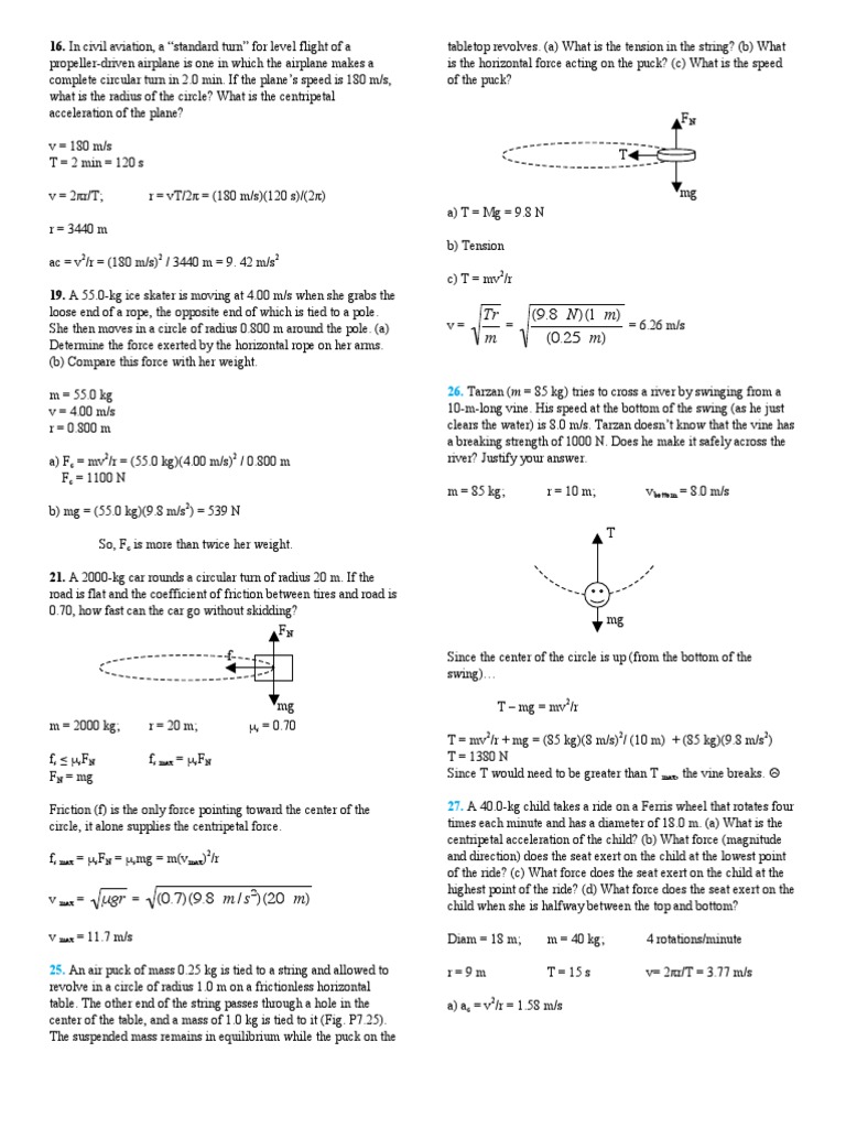 Circular motion worksheet with answers. Circular Motion and Gravitation Review - Answers For Questions #2-#5, identify the type of force which causes the following bold-faced objects to travel along a circular path. 2. An eraser is tied to a string swung in a horizontal circle. 3. The moon orbits the earth. 4. A car makes a sharp right-hand turn along a level roadway. 5. A roller coaster car passes through a loop. PDF Physics Circular Motion Solutions - Evergreen State College Physics Circular Motion Solutions Part I 1. If the radius of the path of a body in uniform circular motion is doubled and the speed is kept the same the force needed must be (a) half as great as before. (b) the same as before. (c) twice as large as before. (d) four times the size as before. Answer (a). Since speed is constant not frequency. 2. PDF PHYSICS 12 CIRCULAR MOTION WORKSHEET 2 - Caddy's Math Shack PHYSICS 12 CIRCULAR MOTION WORKSHEET 2 1. A man swings a 4.0 kg mass in a vertical circle 0.80 m in radius so that it is traveling with a velocity of 5.7 m/s at the lowest point of the circle. Compute the pulling force exerted by the man's hand at this point. 2. An object is revolving in an orbit in a vertical plane. PDF MYP Physics Circular Motion Practice Problems MYP Physics Circular Motion Practice Problems Solutions. 1. During their physics field trip to the amusement park, Tyler and Maria took a rider on the Whirligig. The Whirligig ride consists of long swings which spin in a circle at relatively high speeds. As part of their lab, Tyler and Maria estimate that the riders
